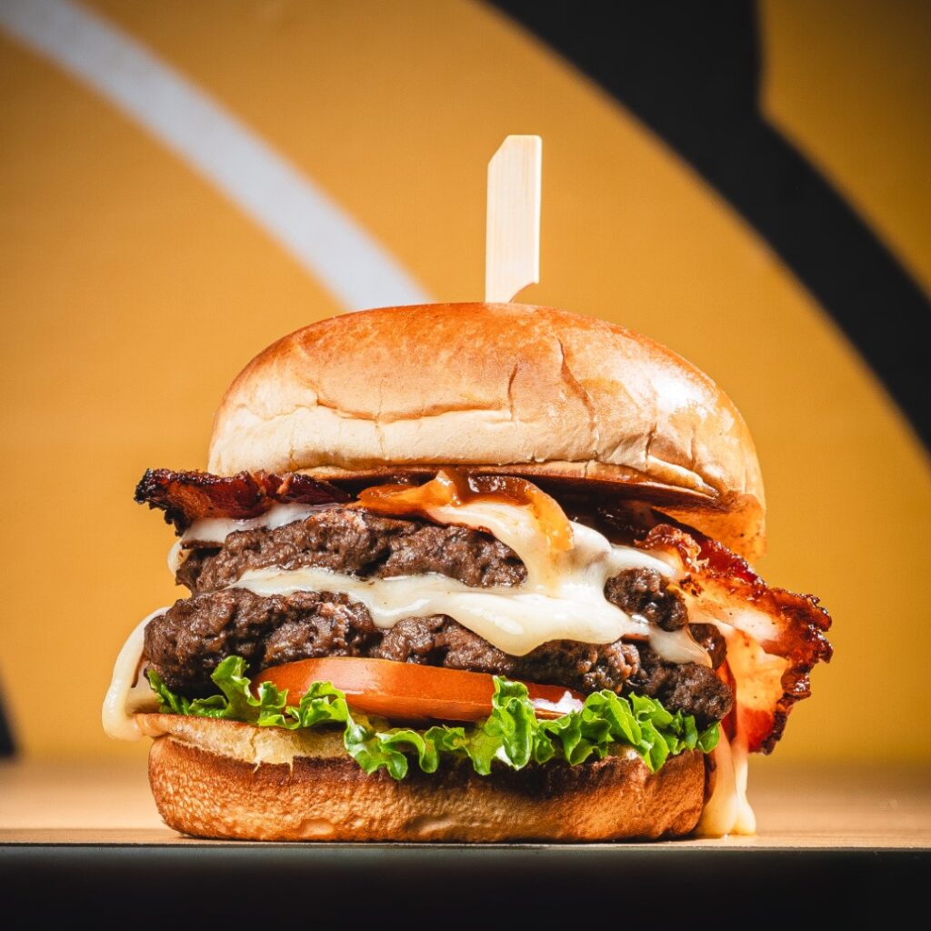 6 0Z BEEF PATTY SMOKED HAM, BACON, PICKLES, RAW ONION, CHEDDAR CHEESE.