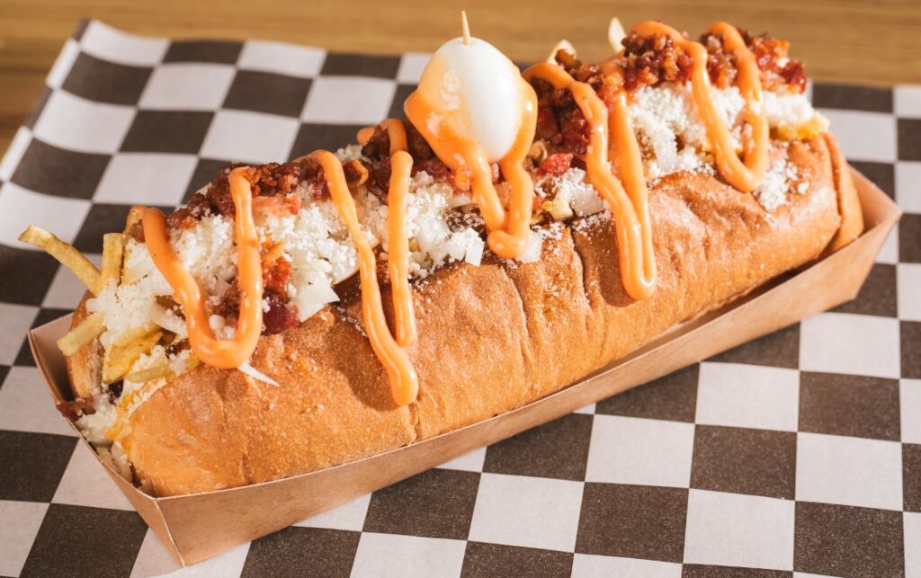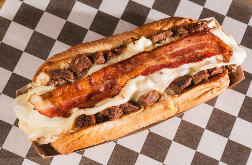 AMERICAN-STYLE SAUSAGE TOPPED WITH MELTED CHEESE, CRISPY BACON, AND TARTARa SAUCE.