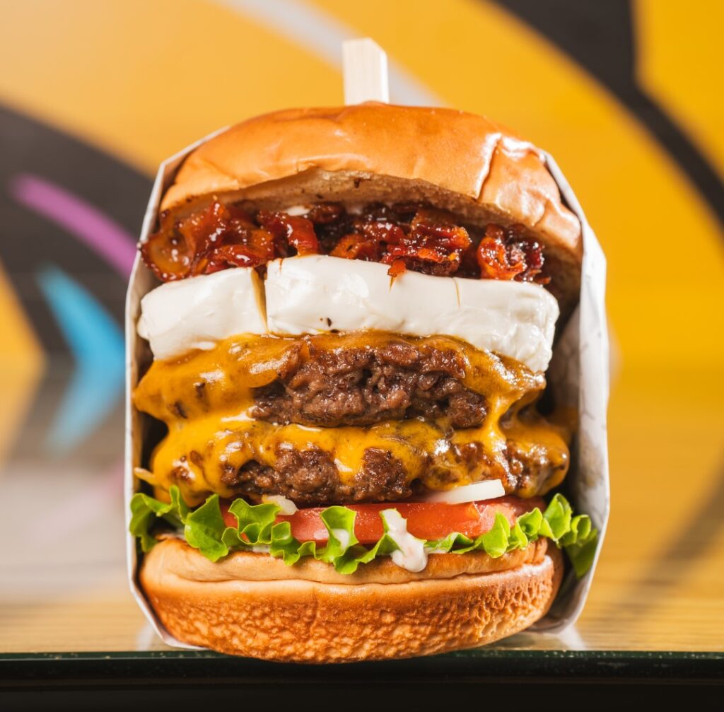 8 oZ BEEF PATTY, BACON JAM, FRESH ONION AND CREAM CHEESE & CHEDDAR CHEESE.