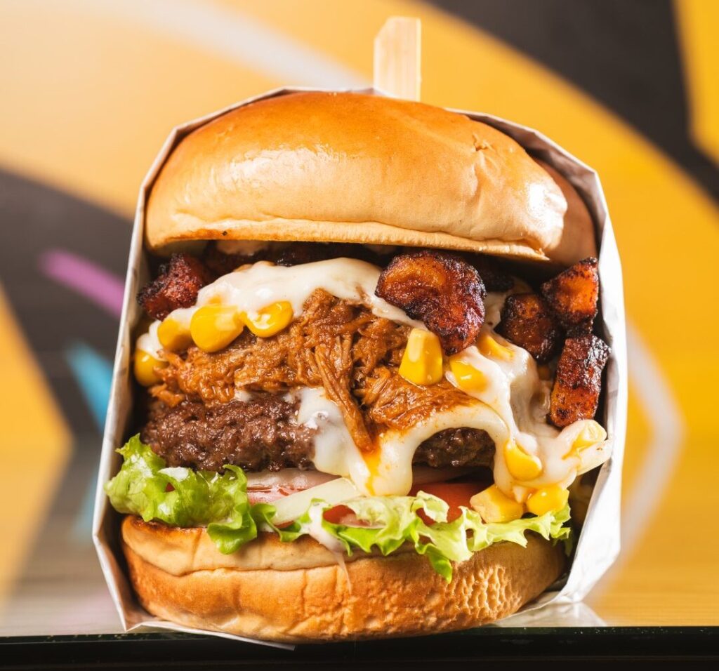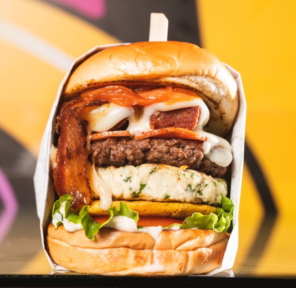 6 OZ BEEF PATTY, 5 OZ SHREDDED CHICKEN IN HOUSE SAUCE GRILLED CHORIZO, SMOKED HAM, YELLOW CORN AREPA, BACON WITH MELTED MOZZARELLA CHEESE.