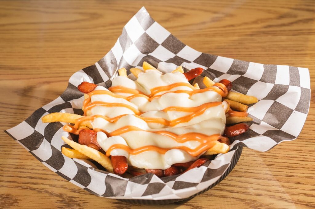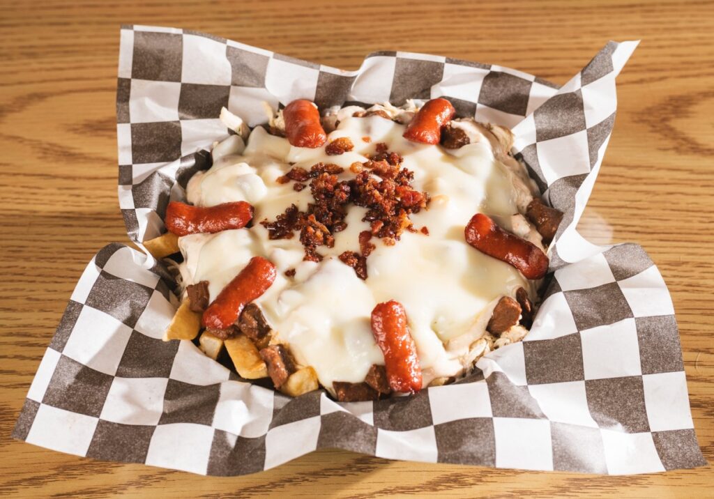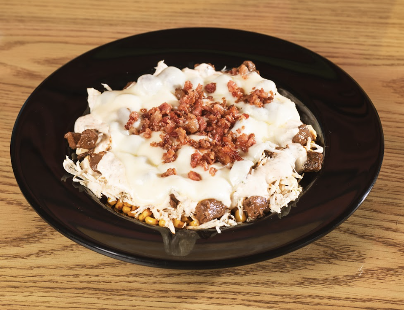 FRENCH FRIES, BEEF, SHREDDED CHICKEN, SAUSAGE, MELTED CHEESE, BACON.