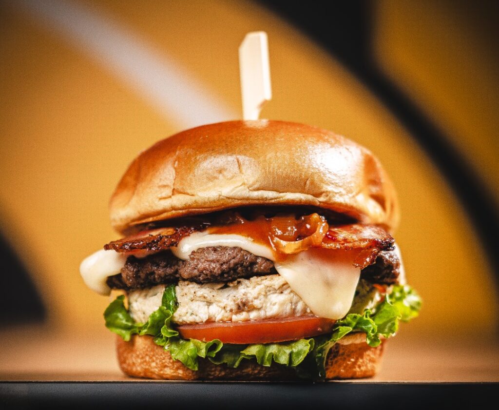 6 oz BEEF PATTY, 5 OZ SHREDDED CHICKEN, HOUSE SAUCE SMOKED HAM, MELTED MOZZARELLA CHEESE, BACON.