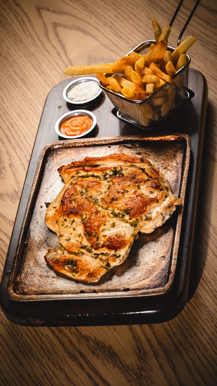 14 OZ GRILLED CHICKEN BREAST FILLET, CHIMICHURRI SAUCE, FRENCH FRIES.
