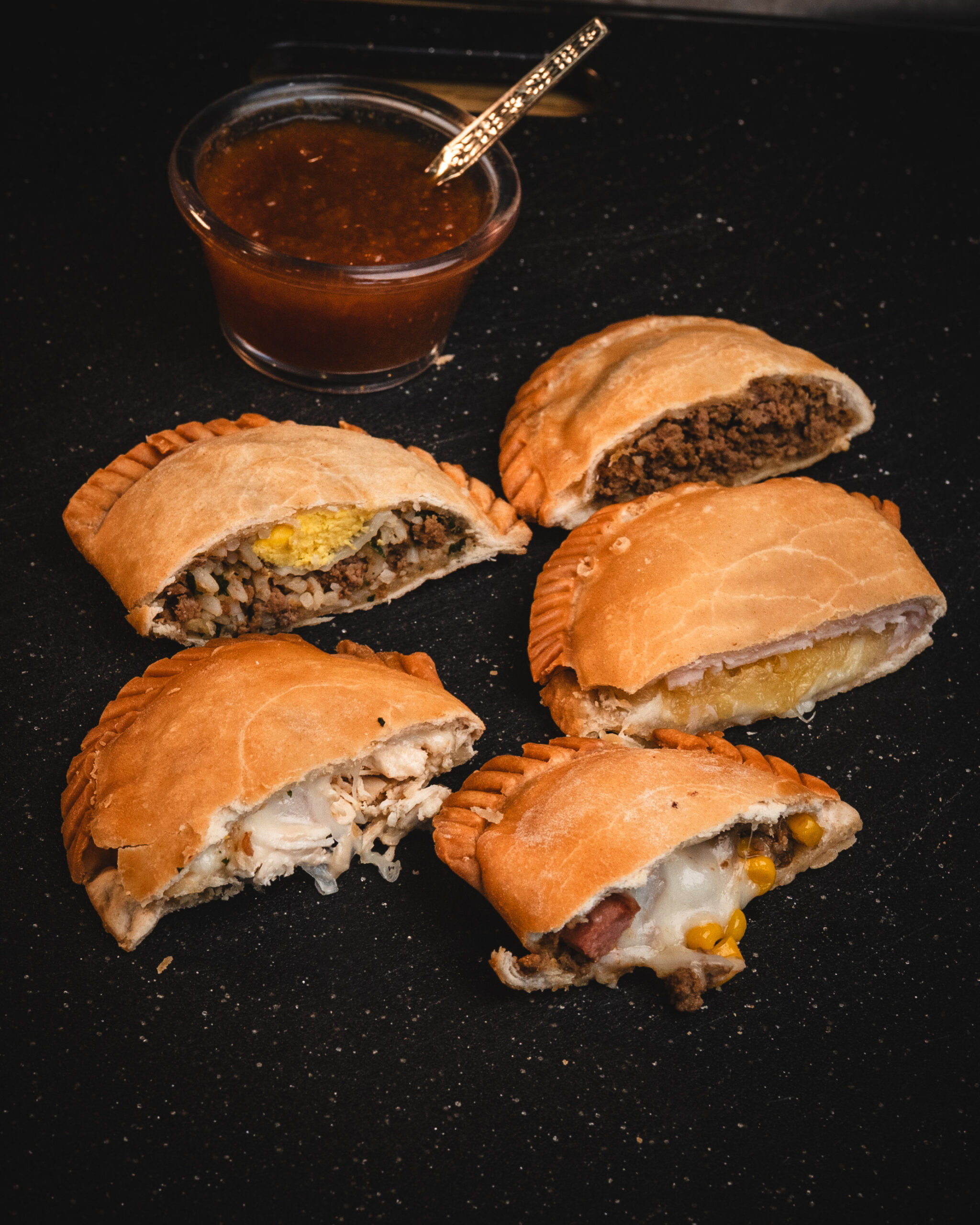 4 OZ GROUND BEEF PATTY, 3.5 OZ SHREDDED BEEF SWEET CORN, BACON, SWEET PLANTAIN FRESH ONION, MELTED MOZZARELLA CHEESE.
