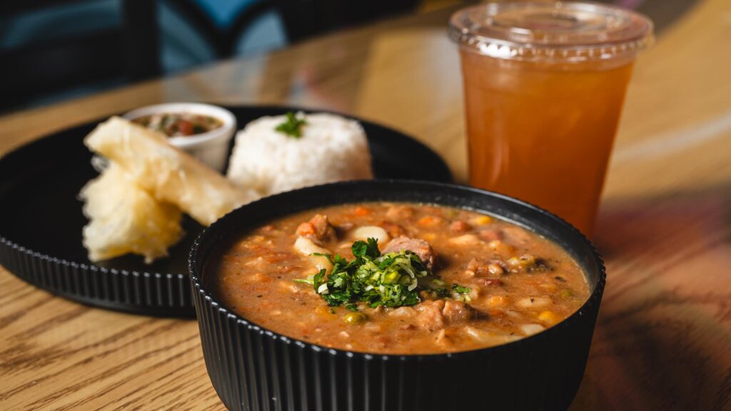 A THICK, HEARTY, NUTRITOUS SOUP SERVED HOT AND ACCOMPANIED BY SANTANDER CHILI SAUCE, CASSAVA & WHITE RICE.